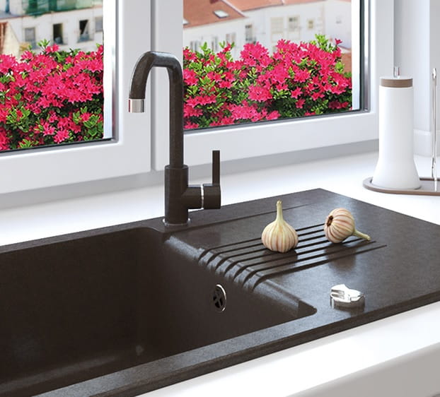 Wersja LAVEO Lena czarna doskonale komponuje się z ciemnymi zlewami granitowymi, kontrastowymi białymi frontami oraz nowoczesnymi, matowymi powierzchniami.