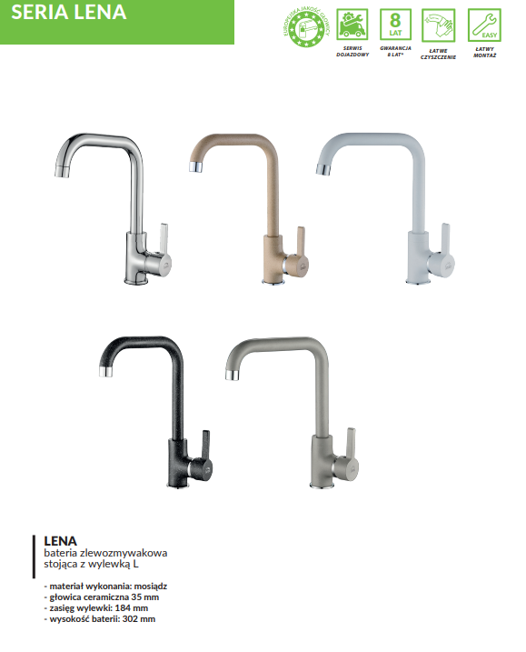 Baterie kuchenne z serii Lena objęte są 8-letnią gwarancją na korpus oraz głowicę, co potwierdza wysoką jakość wykonania i niezawodność na lata codziennego użytkowania w kuchni.