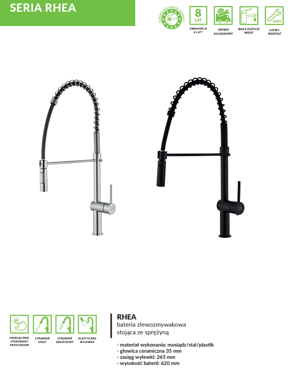 ⭐️Bateria zlewozmywakowa Rhea dedykowana jest kuchniom urządzonym w nowoczesnym stylu. Charakterystyczna sprężyna oplatająca wylewkę dodaje kranowi surowości. Statyw wyposażony w magnes ułatwia korzystanie z baterii i umożliwia szybkie odłożenie wylewki nawet mokrymi rękoma. Rhea posiada dwa rodzaje strumienia wody, które zwiększają jej funkcjonalność. Dzięki niskiej klasie przepływu zmniejszamy zużycie wody, obniżając tym samym wysokość rachunków.