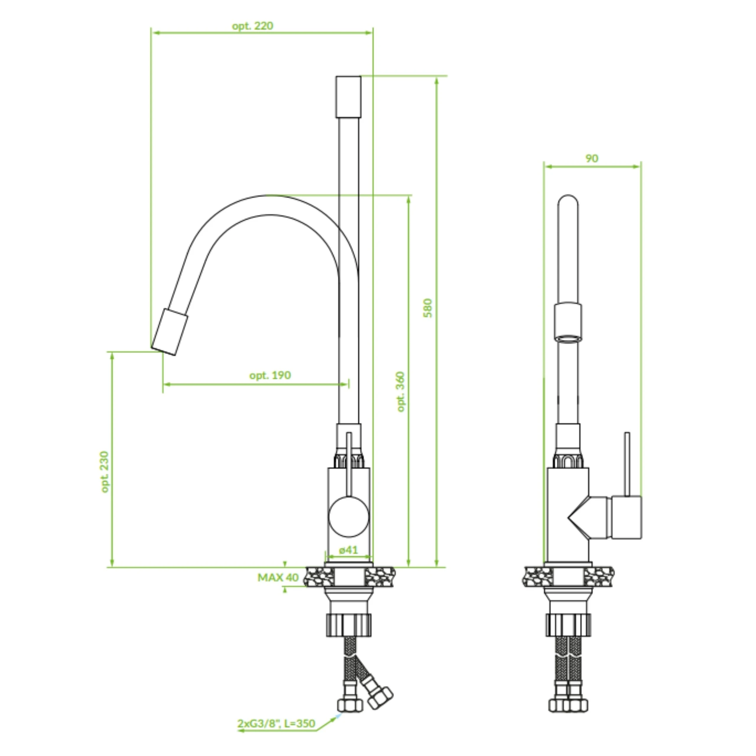 - Zasięg wylewki: opt. 190 mm