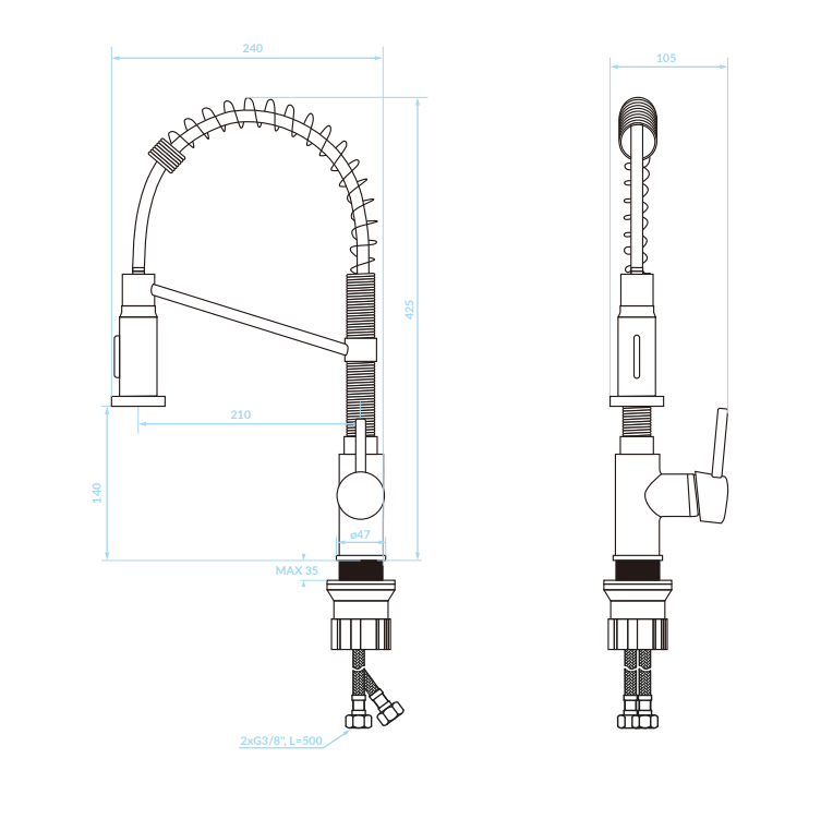 - Wężyki o długości 40 cm. 3/8 cala