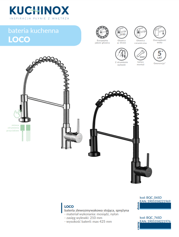 Bateria Loco została wyposażona w elastyczną wylewkę osadzoną na sprężynie, co zapewnia maksymalną swobodę ruchu i ułatwia codzienne prace w kuchni. Dzięki temu strumień wody można skierować dokładnie tam, gdzie jest potrzebny, co jest szczególnie przydatne przy myciu dużych naczyń czy napełnianiu garnków.