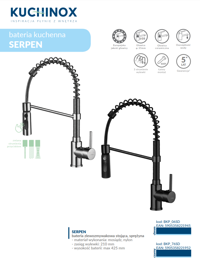 Bateria Serpen w czarnym wykończeniu to nie tylko elegancka ozdoba kuchni, ale także rozwiązanie przyjazne dla środowiska. Klasa przepływu Z pozwala na ograniczenie zużycia wody, co sprzyja oszczędnościom oraz trosce o planetę. Dodatkowo, system montażu z tuleją montażową gwarantuje prostą i stabilną instalację na blacie lub zlewozmywaku.