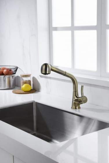Bateria kuchenna zlewozmywakowa Blue Water Retra w kolorze mosiądz antyczny łączy elegancki, ponadczasowy wygląd z praktycznymi rozwiązaniami do codziennego gotowania i zmywania. Stylowe wykończenie pięknie komponuje się z jasnymi i ciemnymi blatami, a kompaktowa forma pasuje zarówno do małych, jak i większych kuchni.