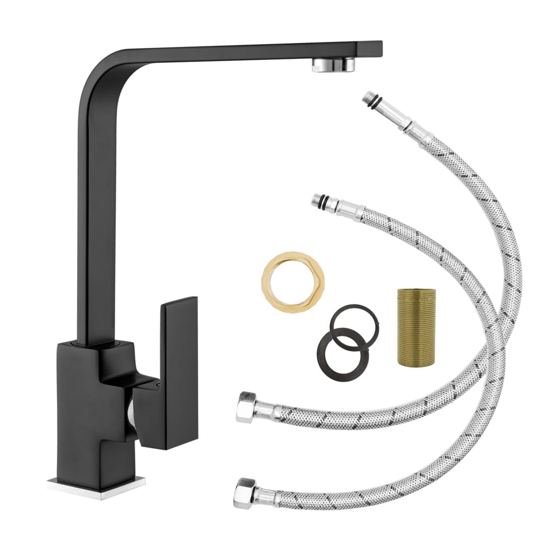 Bateria kuchenna zlewozmywakowa NOOK czarna matowa marki LAVRE to nowoczesna, kanciasta forma połączona z praktycznymi rozwiązaniami do codziennej pracy w kuchni. Solidny mosiężny korpus, wykończenie w kolorze czarny mat z chromowanymi detalami oraz wygodna dźwignia sprawiają, że bateria idealnie pasuje do współczesnych zlewozmywaków i blatów.