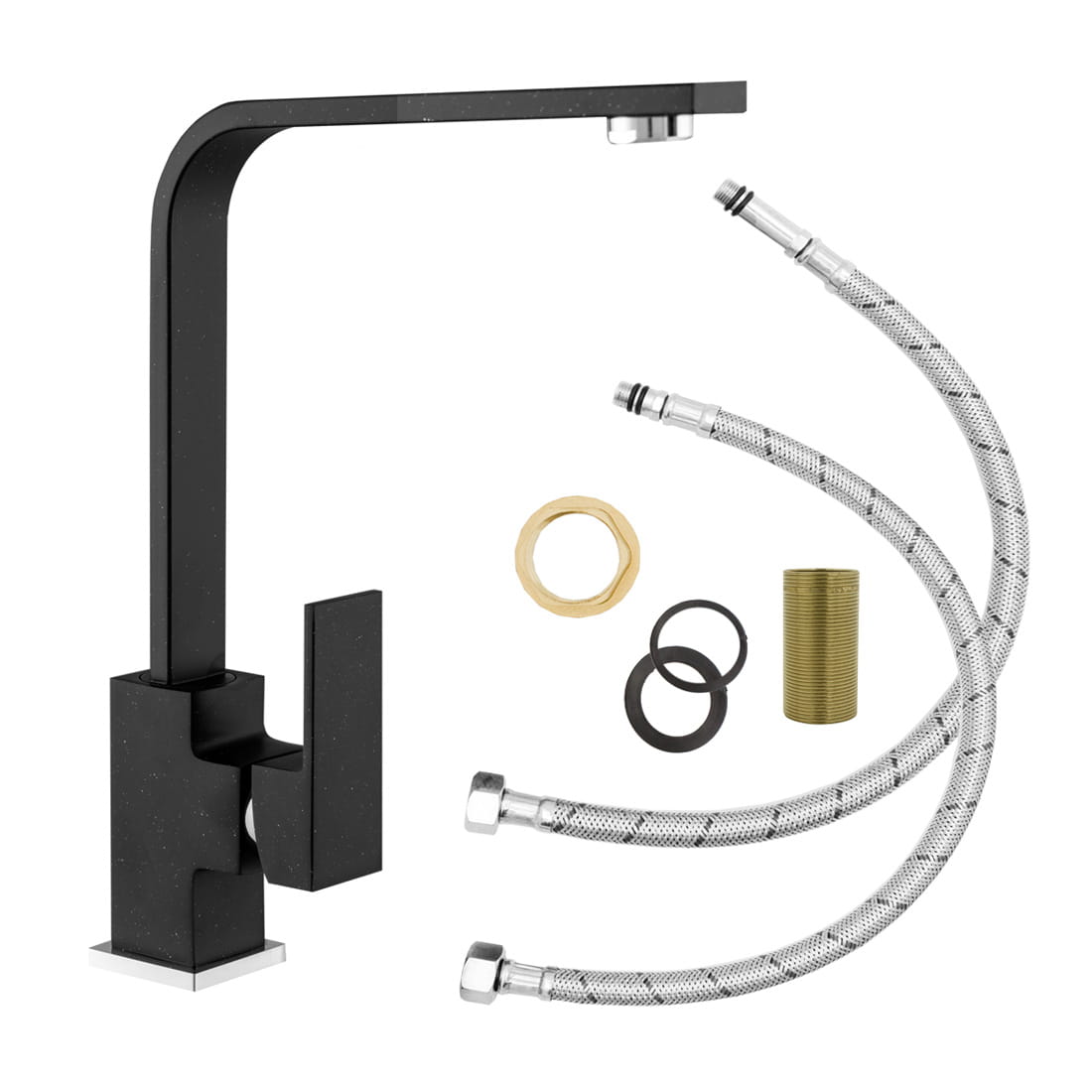 - Kompletny zestaw montażowy – bateria, mocowanie, uszczelki oraz wężyki przyłączeniowe gratis.