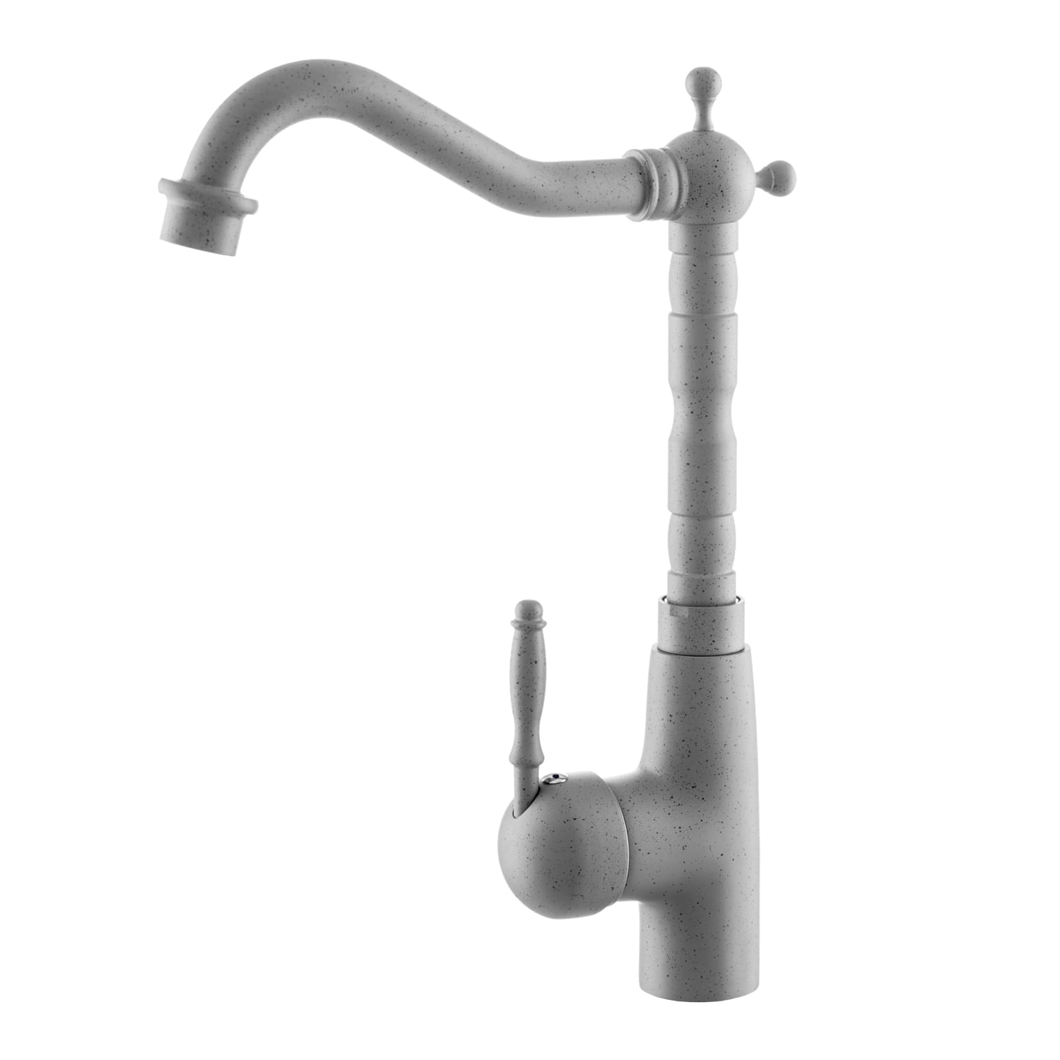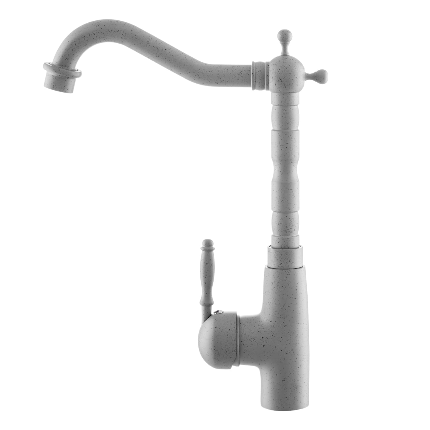 Szara bateria kuchenna zlewozmywakowa retro LAVRE łączy klasyczne wzornictwo z nowoczesną technologią. Charakterystyczna, stylizowana wylewka i dekoracyjny korpus idealnie pasują do kuchni w stylu retro, prowansalskim czy klasycznym, a stonowany szary kolor łatwo dopasować do zlewozmywaków granitowych i blatów w różnych odcieniach.