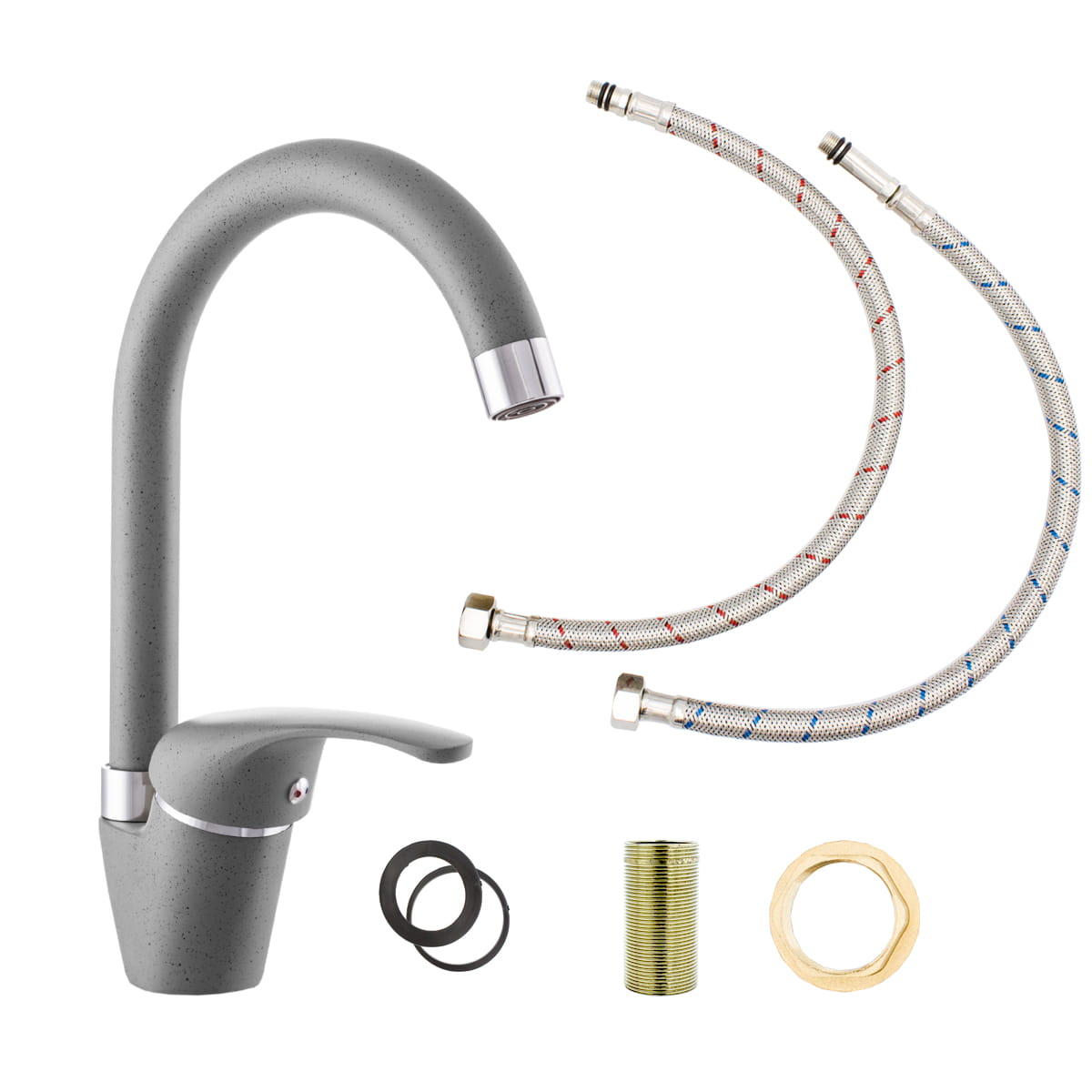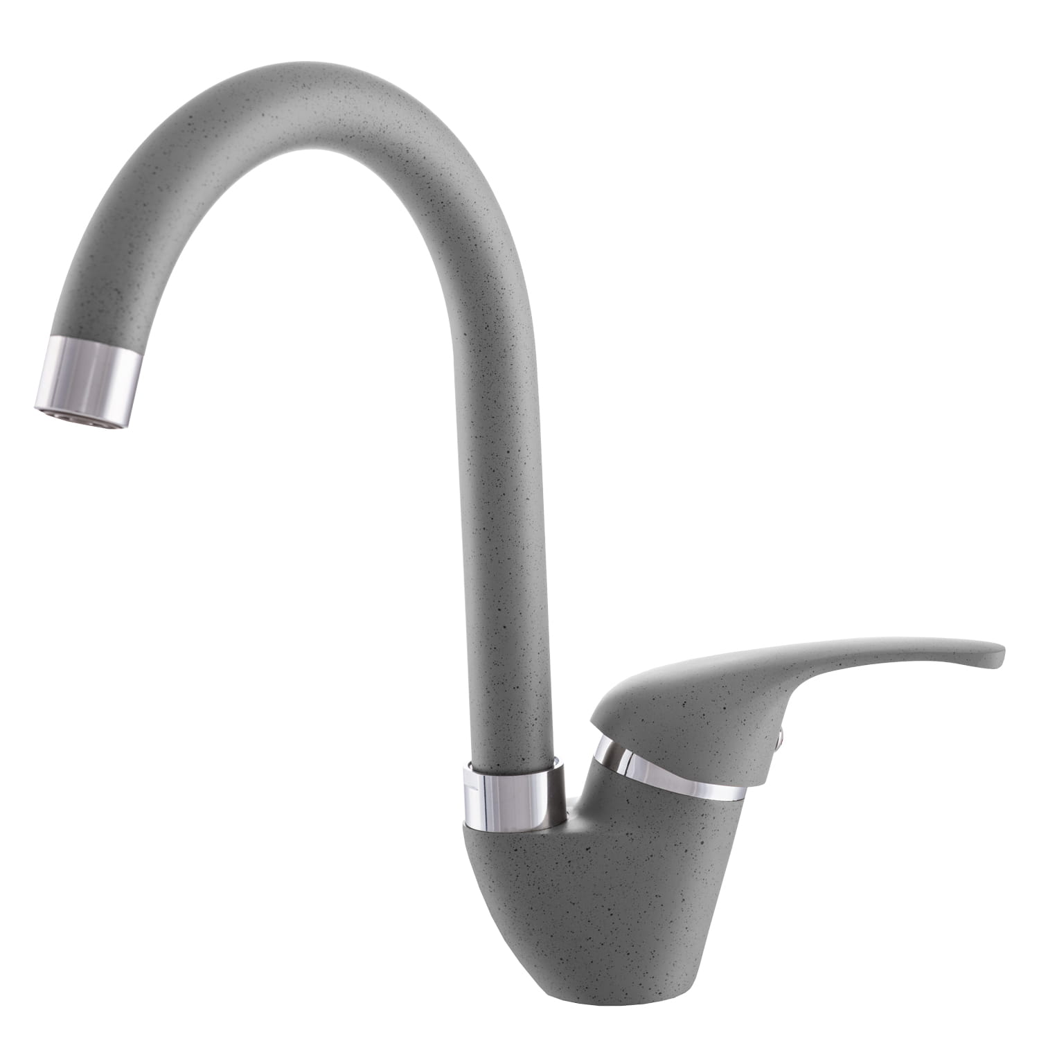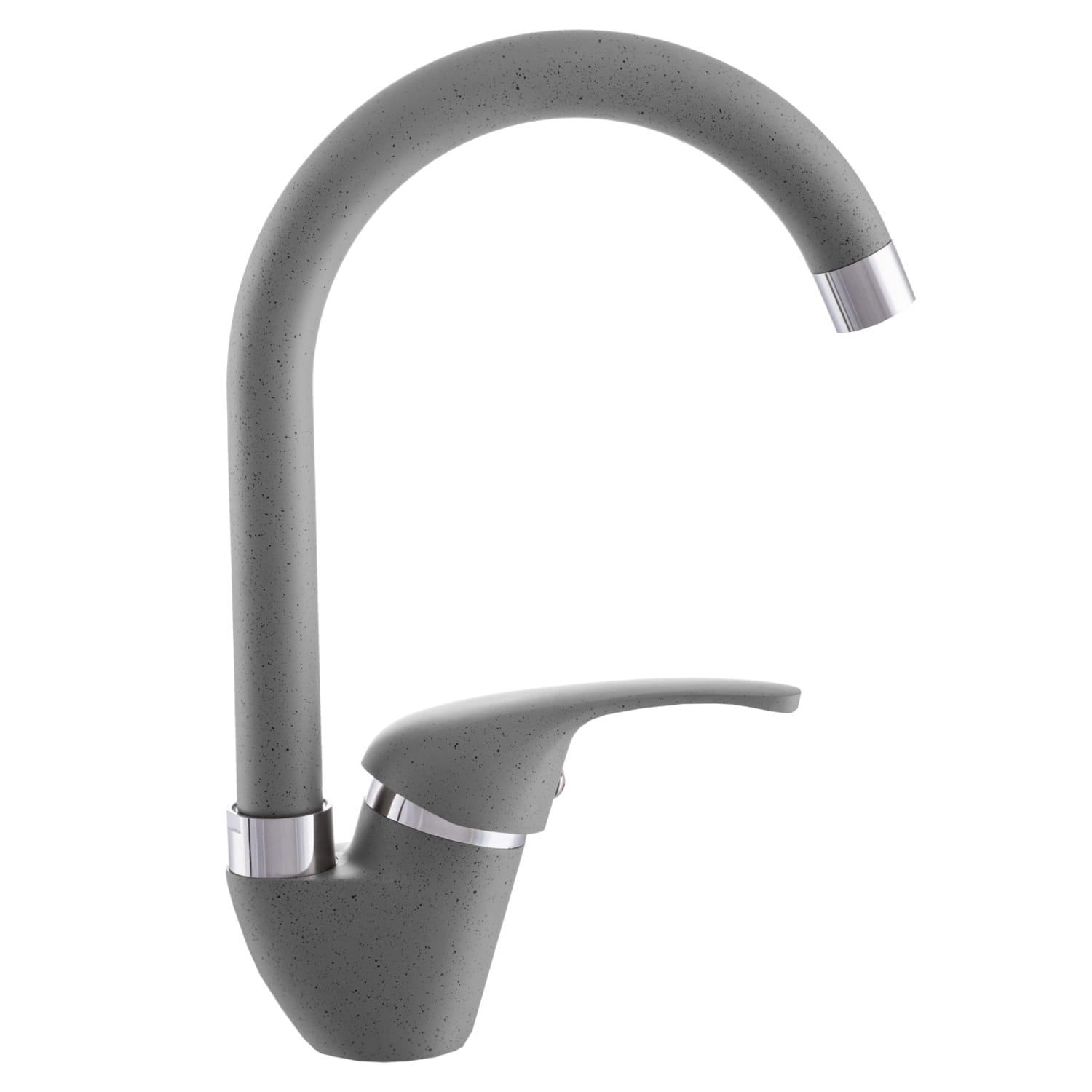 Bateria kuchenna zlewozmywakowa LAVRE RIO w kolorze szary nakrapiany to praktyczne i estetyczne uzupełnienie zlewozmywaka granitowego i stalowego. Wysoka, łukowa wylewka ułatwia mycie naczyń i napełnianie garnków, a stonowana barwa doskonale komponuje się z nowoczesnymi blatami i frontami meblowymi.