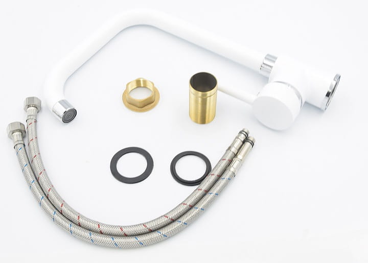 Na zdjęciach produktu widoczny jest pełny zestaw montażowy: korpus baterii z obrotową wylewką, elementy mocujące z mosiądzu, uszczelki oraz elastyczne wężyki przyłączeniowe. Dzięki temu bateria kuchenna zlewozmywakowa STEEL BIAŁA jest gotowa do instalacji od razu po wyjęciu z opakowania.