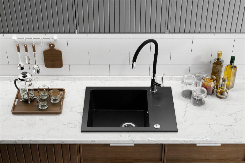 - Kuchniach w stylu nowoczesnym i loftowym – czarna wylewka pięknie współgra z ciemnym zlewozmywakiem oraz stalowymi i czarnymi dodatkami.