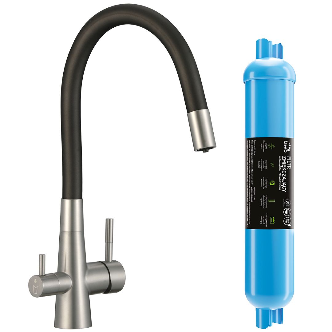 Bateria kuchenna zlewozmywakowa z podłączeniem filtra wody LAVEO RIVECO STAL SZCZOTKOWANA CZARNY filtr zmiękczający w zestawie