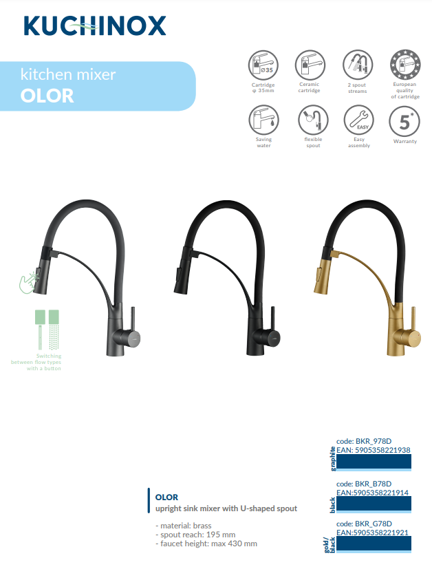 Wykonana z trwałego materiału – mosiądzu – bateria zlewozmywakowa Olor gwarantuje odporność na codzienne zużycie. Jej eleganckie grafitowe wykończenie nadaje subtelną, ale nowoczesną atmosferę, idealnie komponując się z minimalistycznymi lub industrialnymi aranżacjami kuchennymi.
