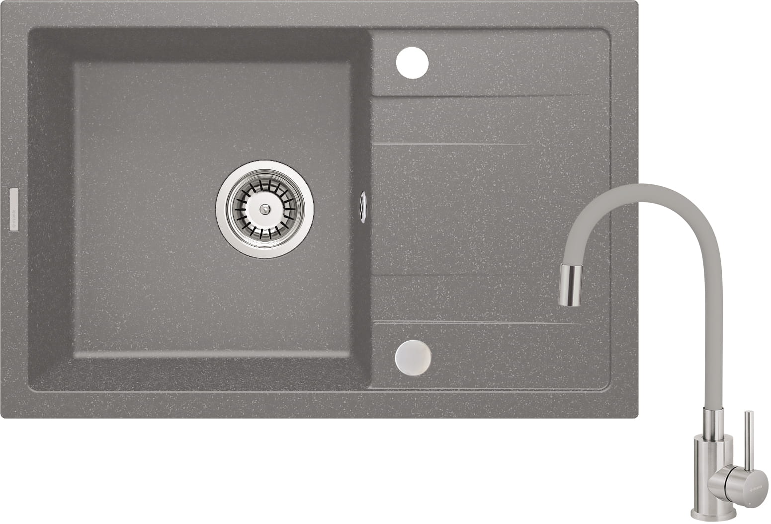 Zlewozmywak granitowy CORIO szary metalik z baterią to kompletny zestaw do nowoczesnej kuchni, w którym funkcjonalność idzie w parze z ponadczasowym designem. Jedna pojemna komora, praktyczny ociekacz oraz dopasowana kolorystycznie, elastyczna bateria tworzą rozwiązanie idealne do codziennego gotowania i zmywania.