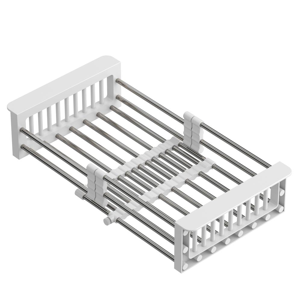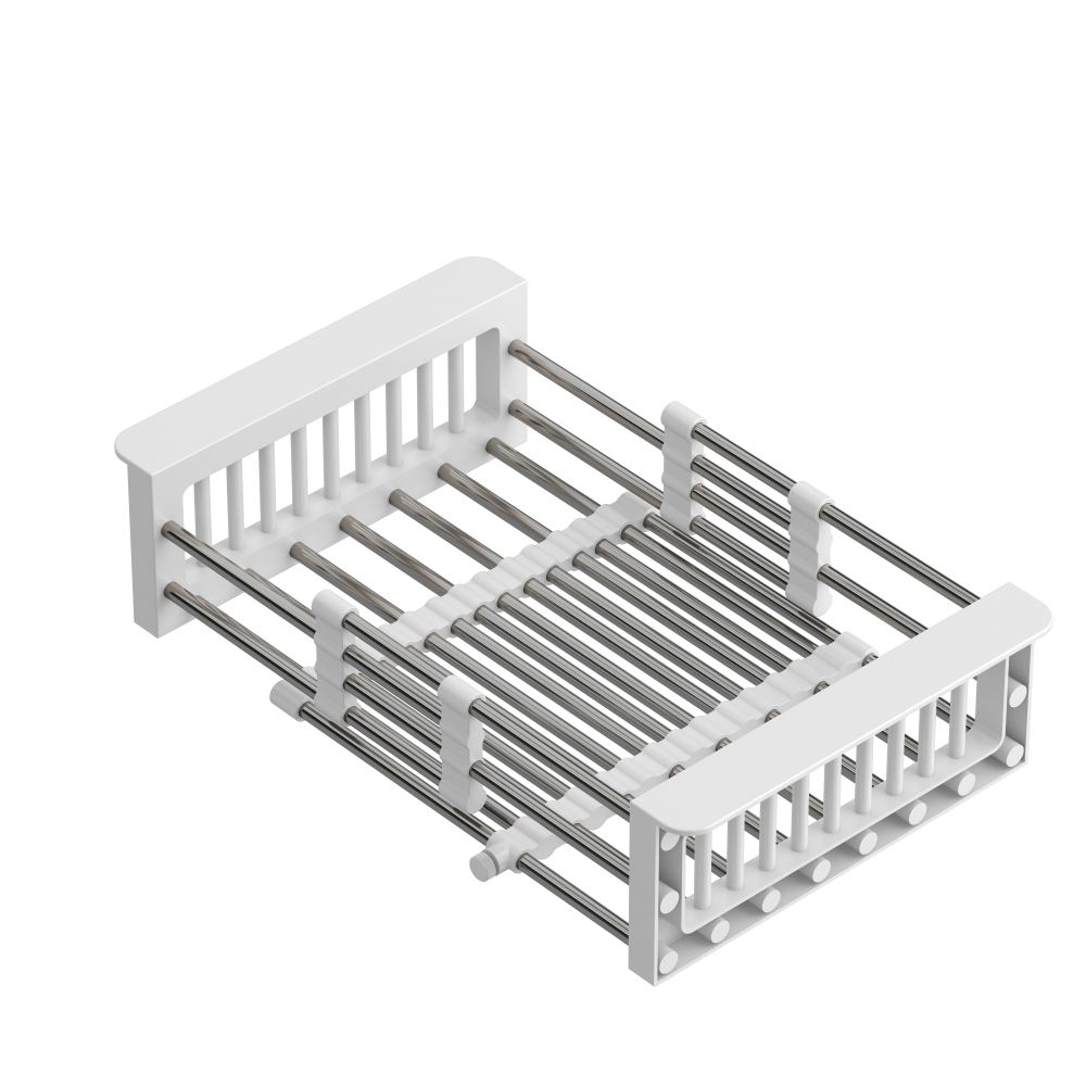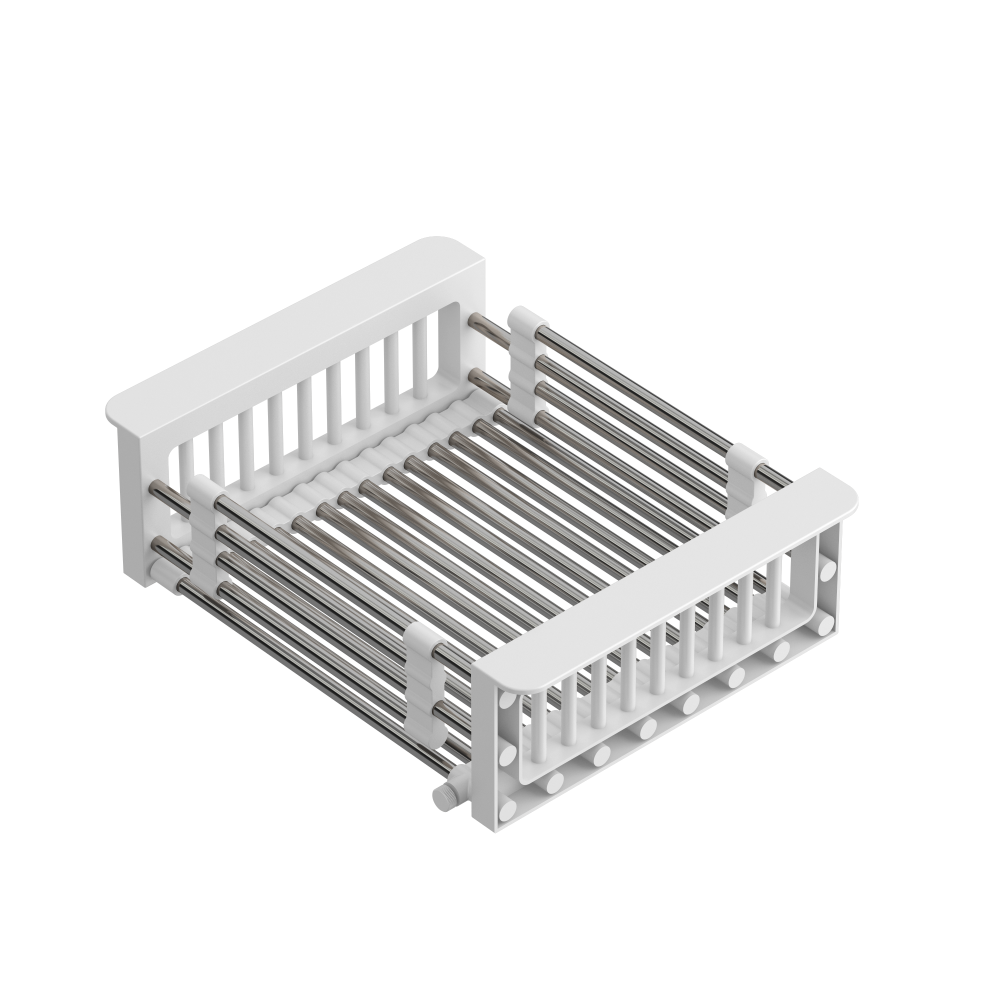 Regulowany koszyk QUADRON w kolorze stalowym z białym wykończeniem to funkcjonalna suszarka do naczyń do zlewu, która ułatwia codzienne prace kuchenne. Regulowana szerokość pozwala dopasować koszyk do różnych komór zlewozmywaka i wygodnie wykorzystać przestrzeń roboczą.