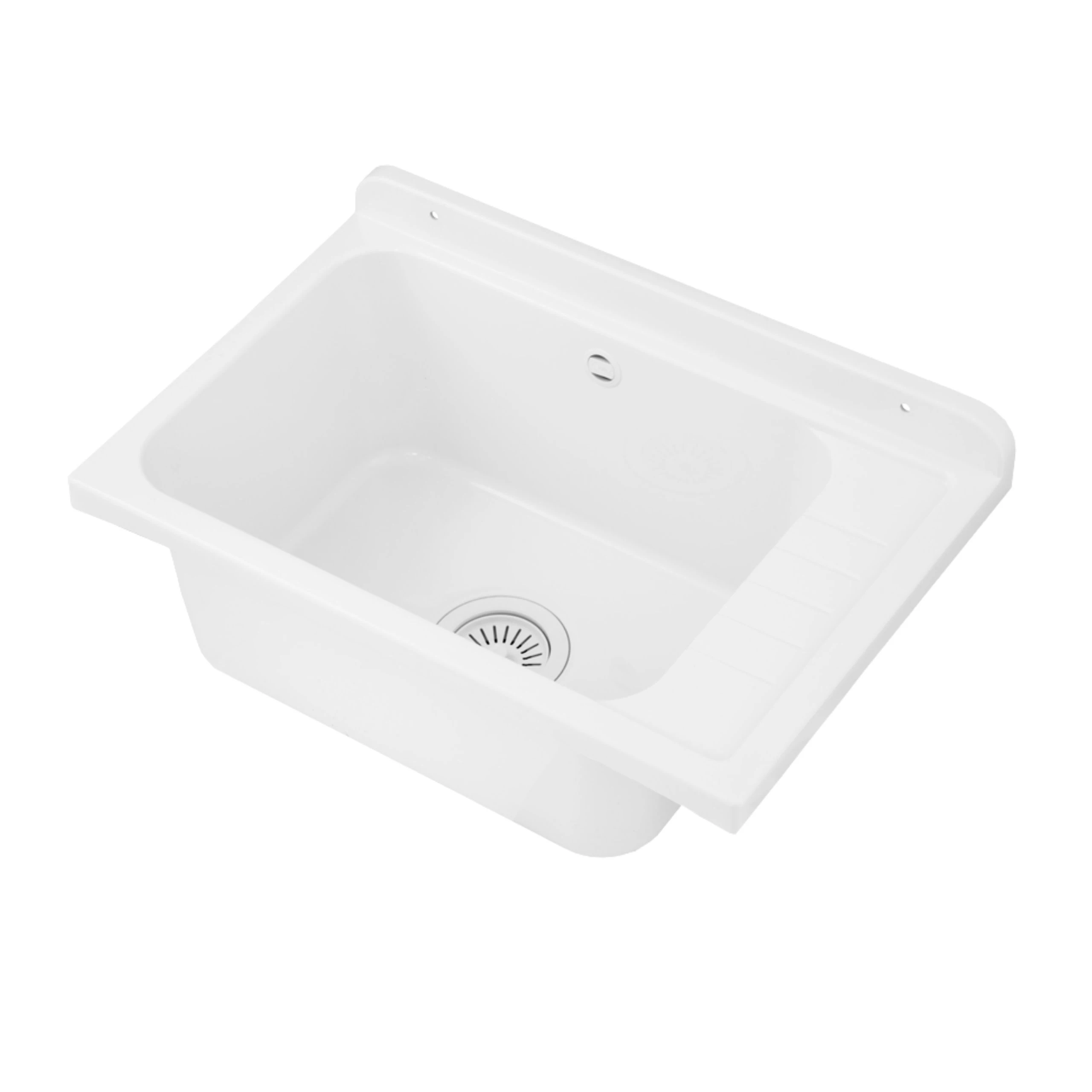 Materiał komory to polipropylen – tworzywo o wysokiej odporności na różne substancje i związki chemiczne oraz na podwyższone temperatury. Dzięki temu zlew gospodarczy nie odbarwia się i nie ulega szybkiemu zużyciu nawet przy częstym kontakcie z detergentami, środkami piorącymi czy preparatami do sprzątania.