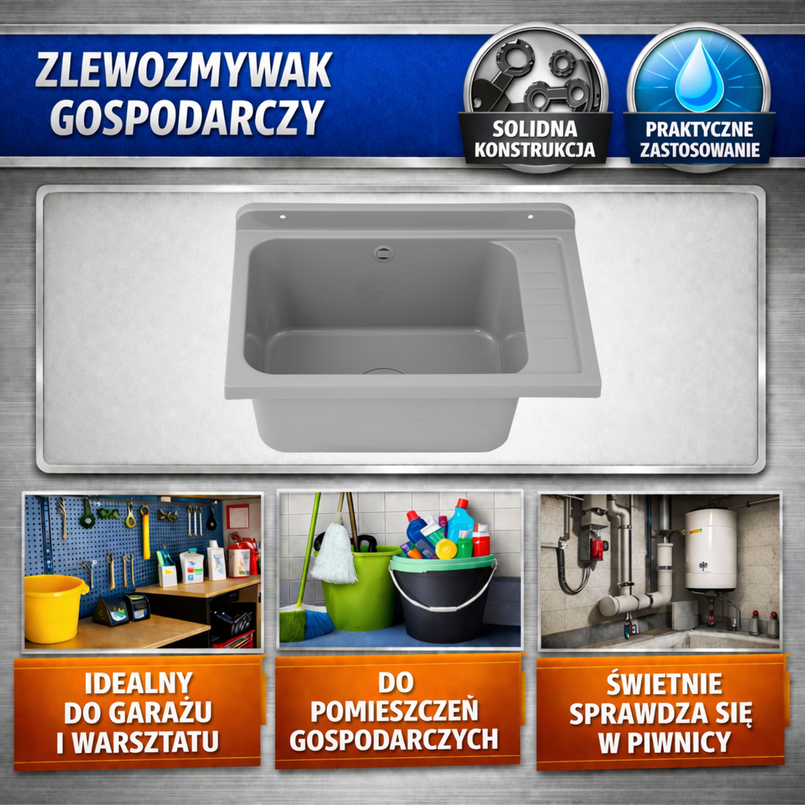 Zlew gospodarczy SELVA SZARY z szafką to praktyczny zestaw, który łączy wytrzymałość, wygodę użytkowania oraz nowoczesny wygląd. Dzięki przemyślanej konstrukcji zapewnia komfort pracy nawet w trudnych warunkach. Duża, głęboka komora umożliwia wygodne mycie narzędzi, mopów czy większych przedmiotów, a funkcjonalna szafka pod zlewem pozwala utrzymać porządek i przechowywać niezbędne akcesoria. Zestaw zawiera: