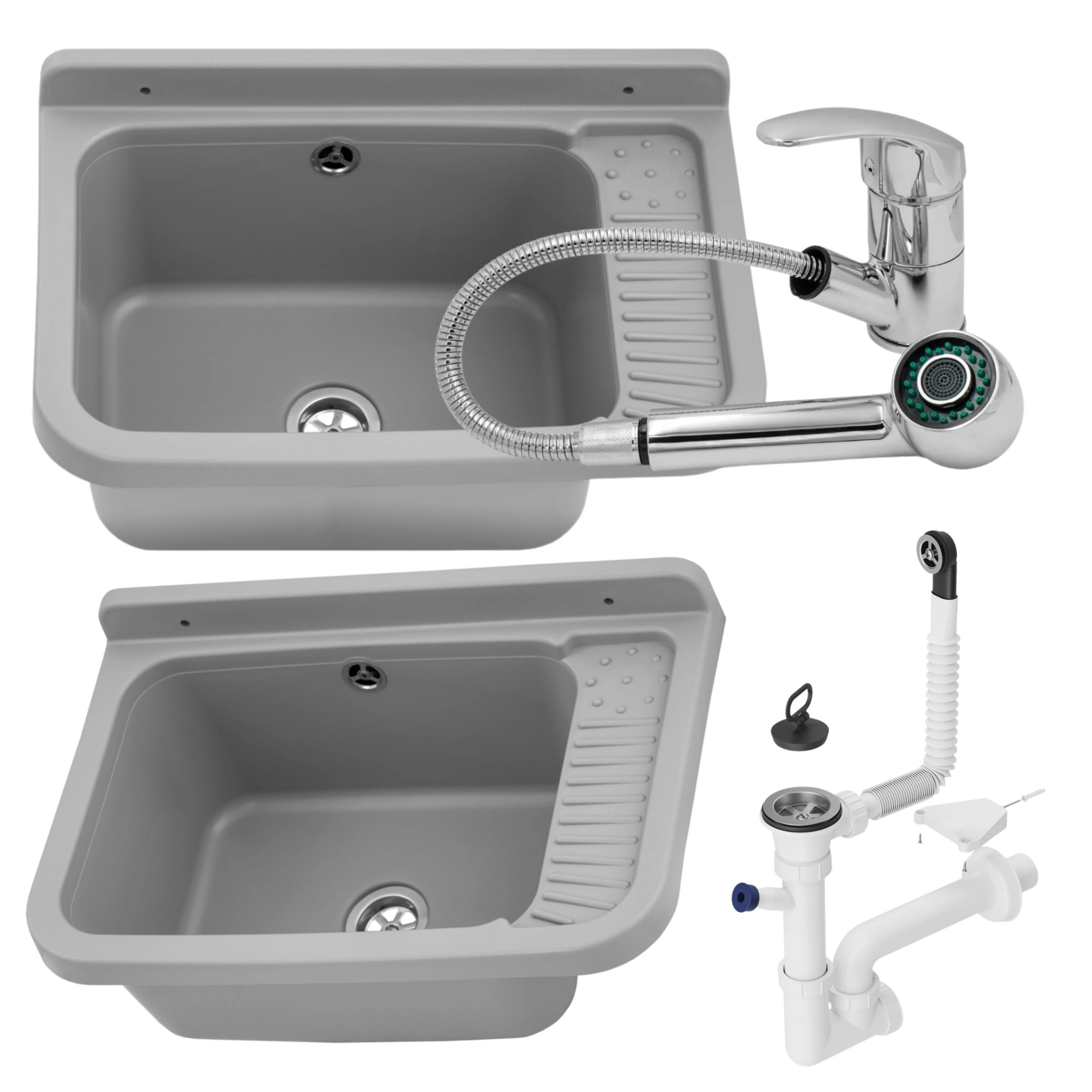 Zlewozmywak gospodarczy GRADIA SZARY Bateria ATUT CHROM z wyciąganą wylewką