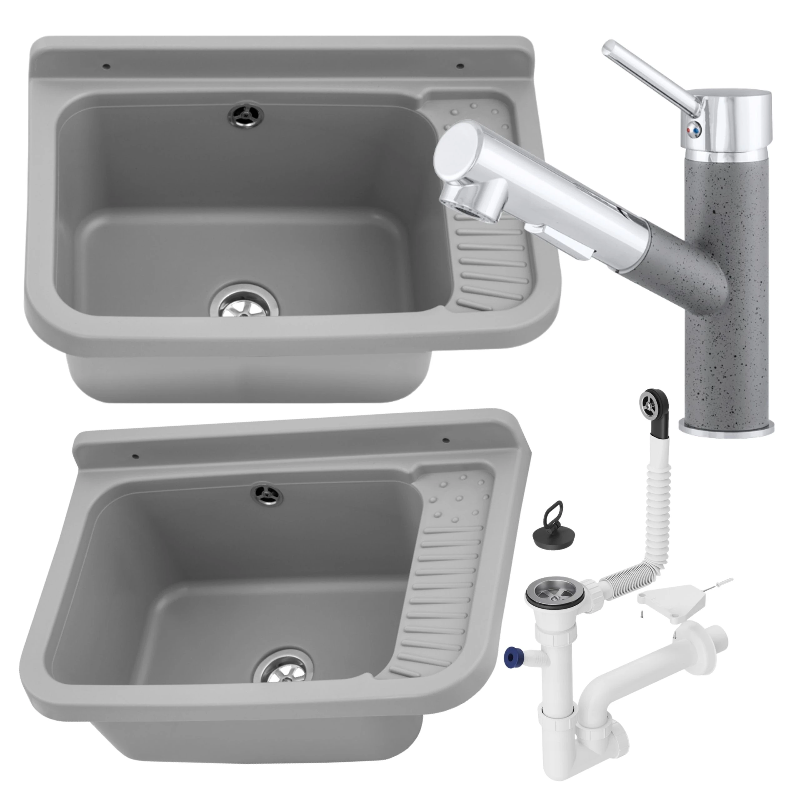 Zlew gospodarczy GRADIA z baterią CADO dostarczany jest jako kompletny zestaw – po wyjęciu z pudełka masz wszystko, czego potrzebujesz do instalacji:
