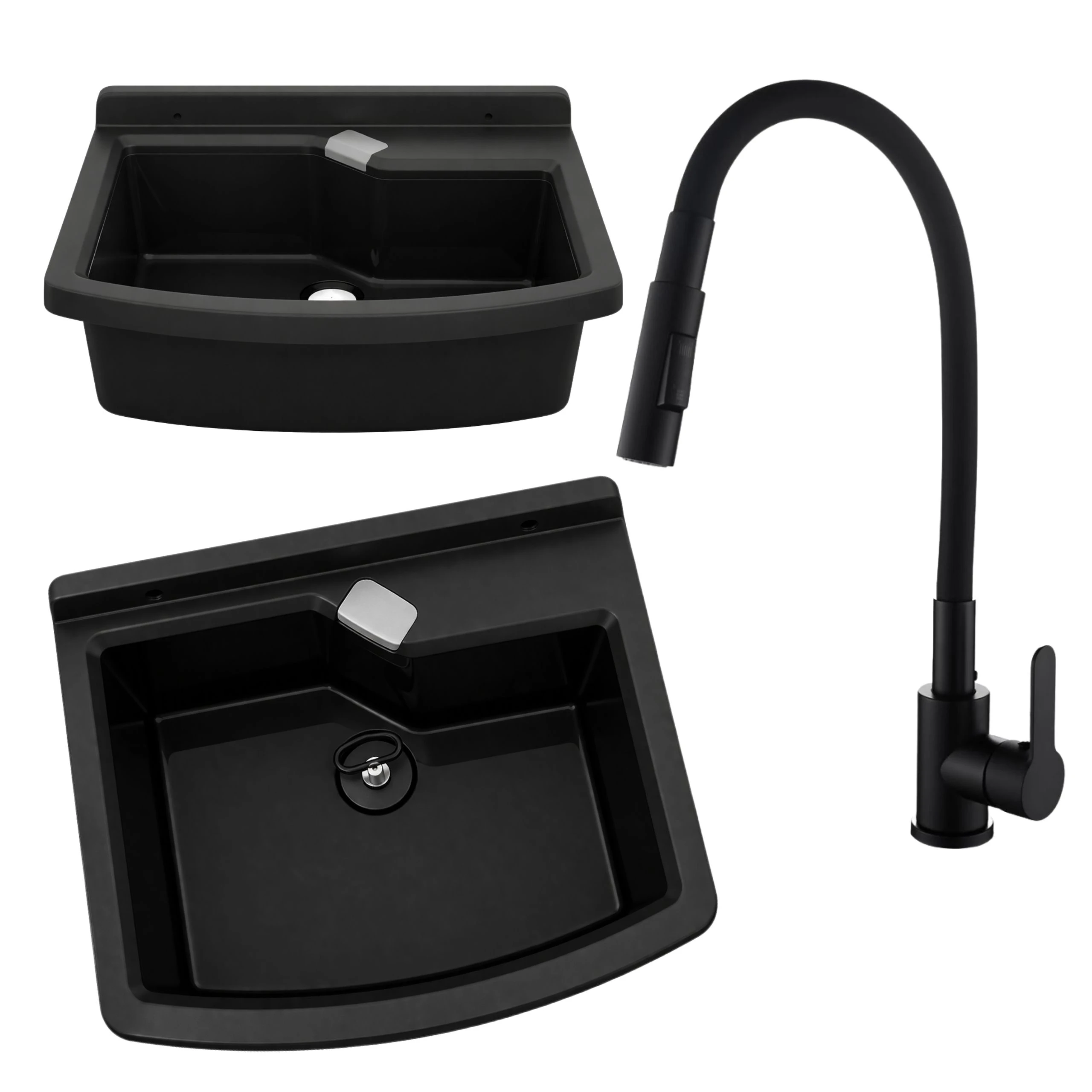 Zlewozmywak gospodarczy LIRA 50 cm CZARNY Bateria stojąca FLEX elastyczna dwufunkcyjna wylewka