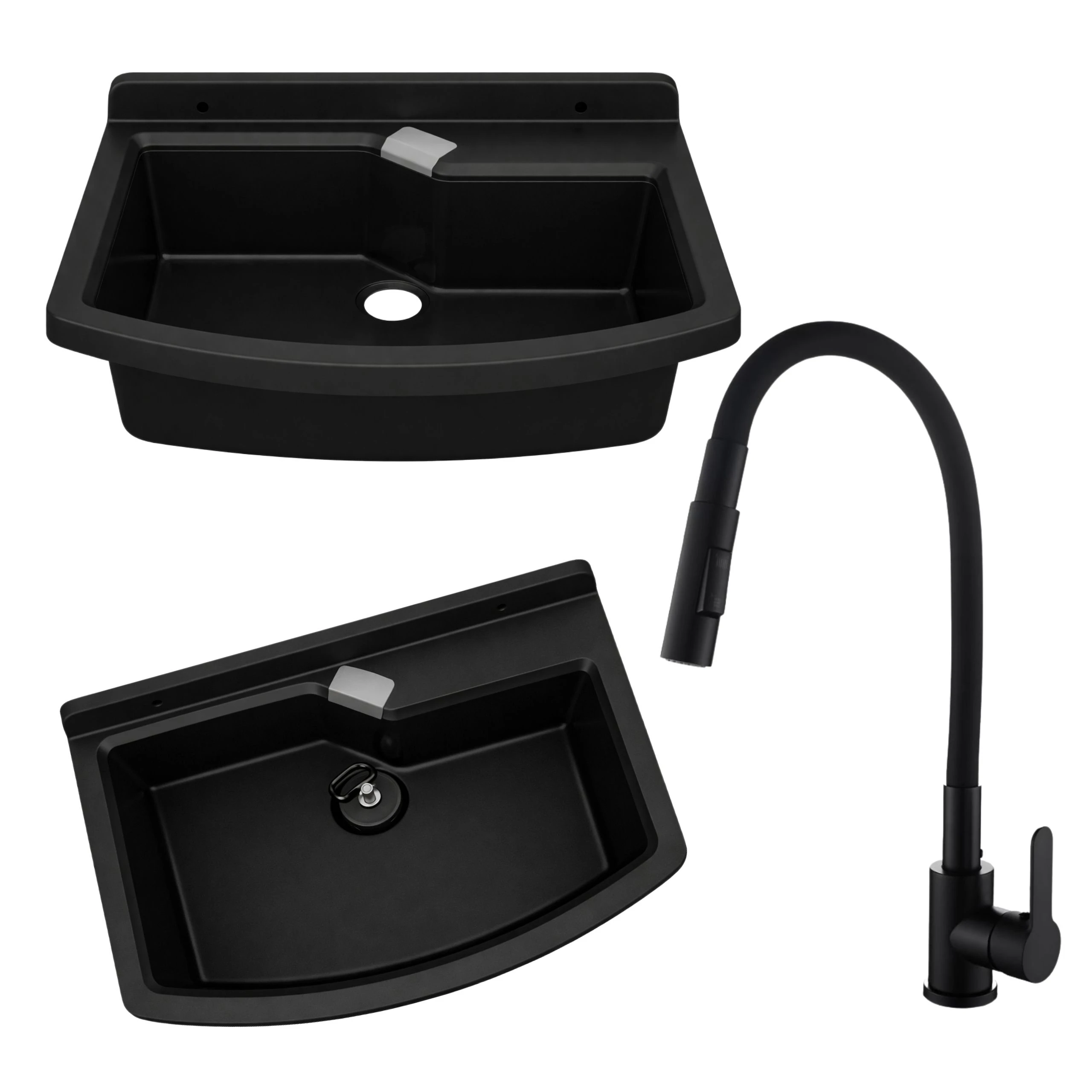 Zlewozmywak gospodarczy LIRA 60 cm CZARNY Bateria stojąca FLEX elastyczna dwufunkcyjna wylewka