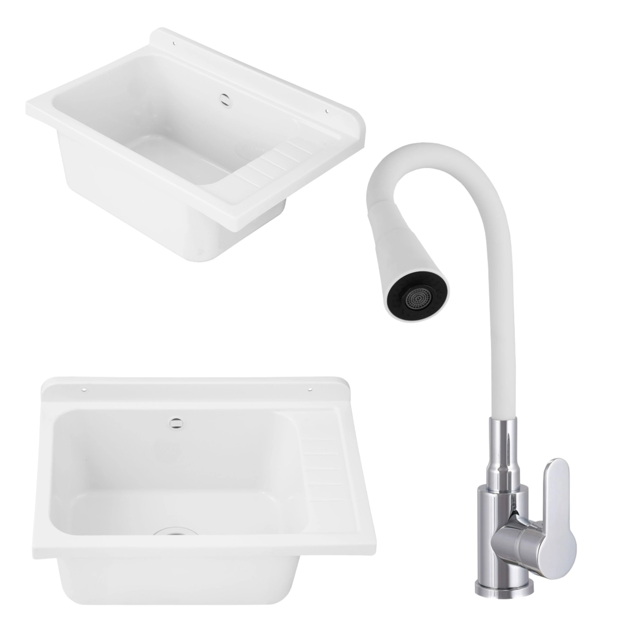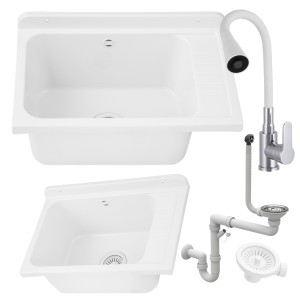 Zlewozmywak gospodarczy SELVA BIAŁY 58x38 Bateria stojąca FLEX elastyczna wylewka biała
