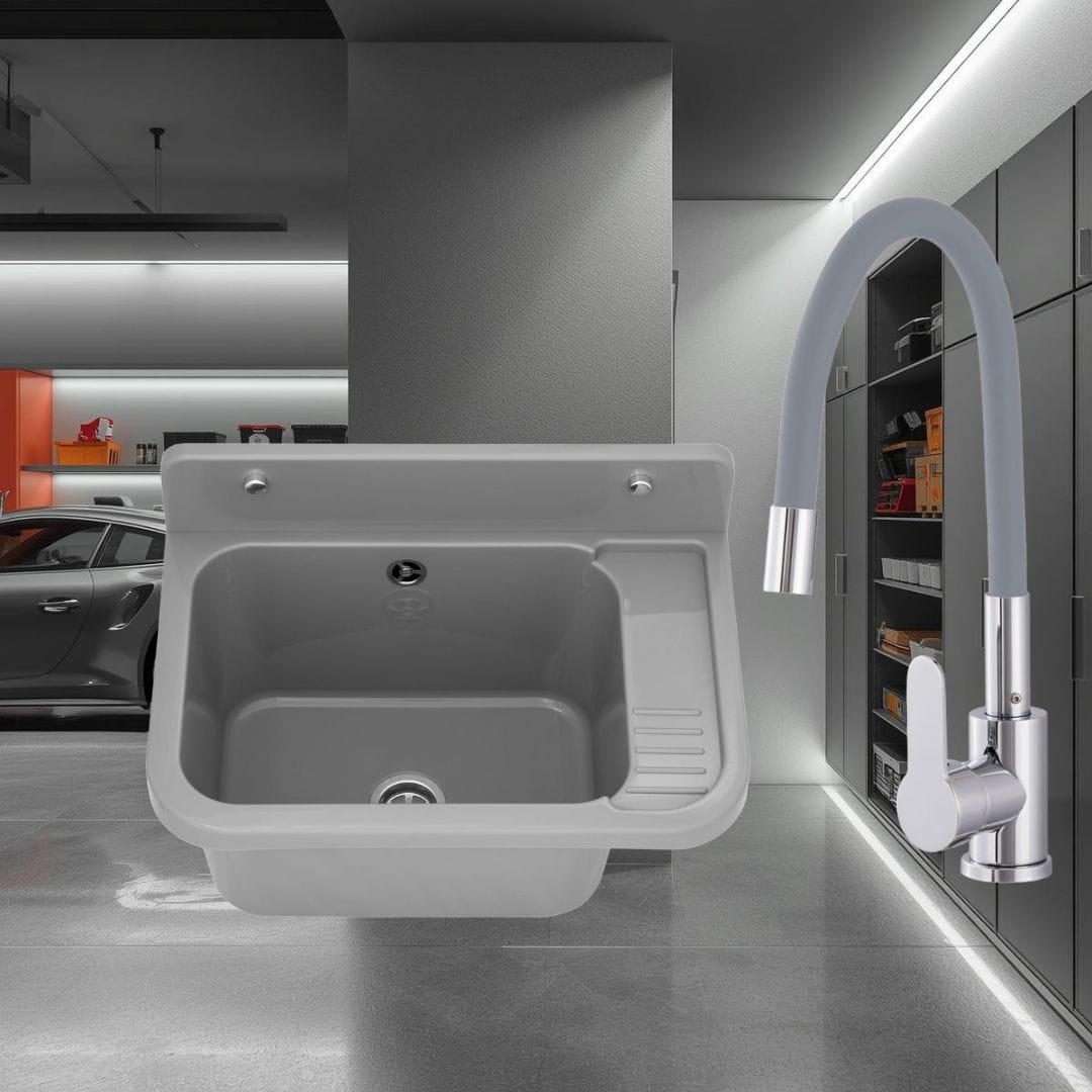 Zlewozmywak gospodarczy VIGO 50x34 w kolorze szarym z baterią stojącą FLEX to kompletny, gotowy do montażu zestaw polskiej marki LAVRE, zaprojektowany z myślą o intensywnym użytkowaniu w pomieszczeniach gospodarczych i technicznych. Wytrzymała komora z polipropylenu oraz bateria z elastyczną wylewką tworzą funkcjonalne stanowisko do mycia, płukania i prac porządkowych.