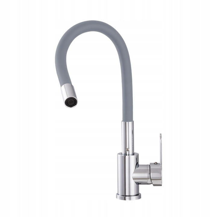 W zestawie znajduje się bateria stojąca FLEX w kolorze szarym, idealnie dopasowana kolorystycznie do zlewu. Elastyczna silikonowa wylewka pozwala kierować strumień wody dokładnie tam, gdzie jest potrzebny – ułatwia napełnianie wiader, mycie narzędzi czy większych elementów.