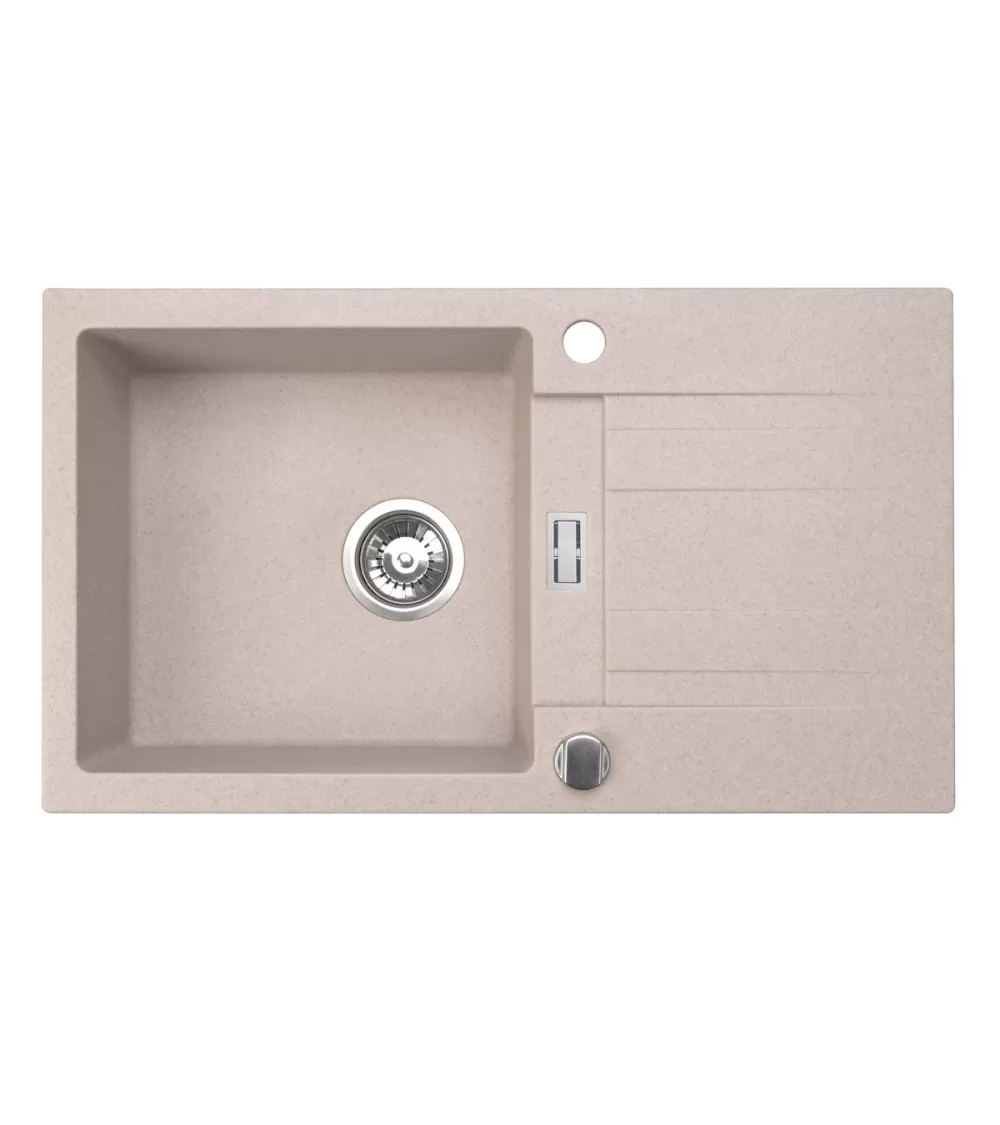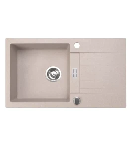 Zlewozmywak granitowy BRENOR ATHENA 76x44 cm to kompaktowy, jednokomorowy zlewozmywak z ociekaczem, idealny do nowoczesnych i klasycznych kuchni. Beżowy, piaskowy odcień subtelnie komponuje się z blatami drewnianymi, laminowanymi i kamiennymi, tworząc elegancką i spójną przestrzeń roboczą.