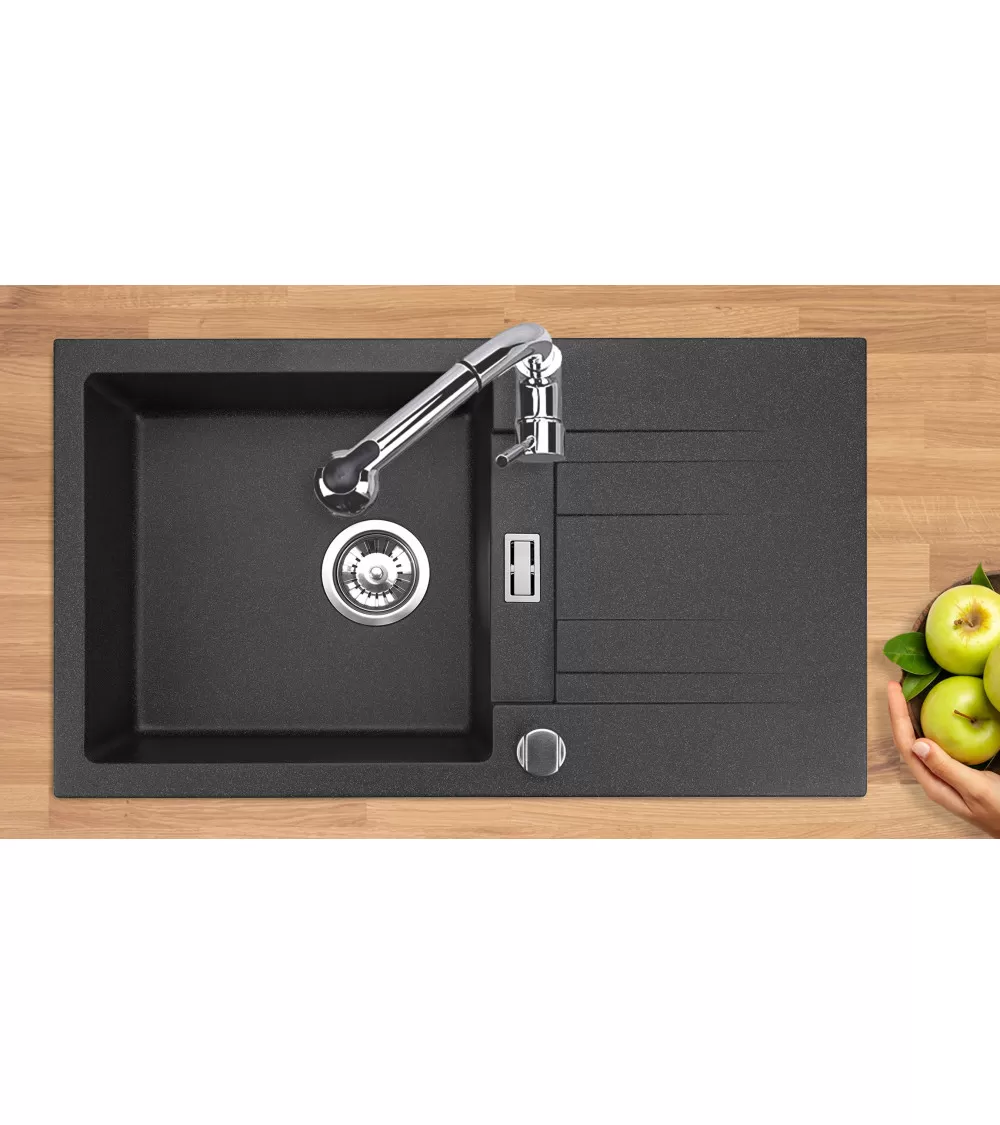 Dzięki klasycznym wymiarom i nowoczesnemu wykończeniu czarny metalik zlewozmywak doskonale pasuje zarówno do kuchni nowoczesnych, jak i bardziej tradycyjnych.
