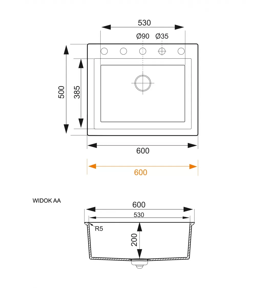 - Otwory w zlewozmywaku: standardowo brak – wykonujemy otwory na indywidualne życzenie (informacja w wiadomości do sprzedającego podczas składania zamówienia)