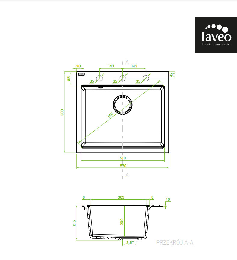Zlewozmywak granitowy LAVEO Tau to model wpuszczany w blat o wymiarach zewnętrznych 570 x 500 x 215 mm (minimalna szerokość szafki – 600 mm). Szczegółowe wymiary komory i sposób montażu przedstawia poniższy rysunek techniczny: