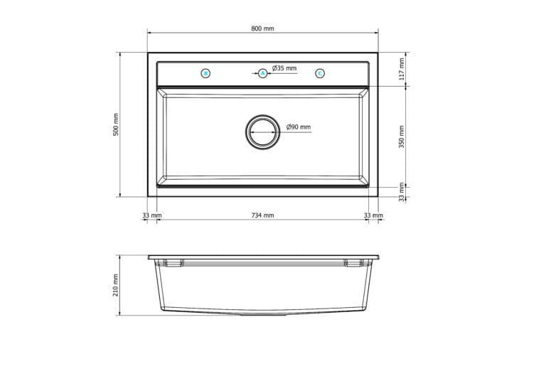 Otwory w zlewozmywaku mogą zostać przygotowane fabrycznie – maksymalnie 3 sztuki. Przy składaniu zamówienia wystarczy podać oznaczenia A, B, C widoczne na rysunku technicznym.