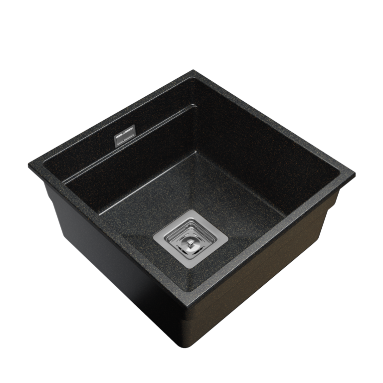 Zlewozmywak granitowy LAVRE DECOR 44x45 to kompaktowy, jednokomorowy zlew kuchenny o nowoczesnym wyglądzie i wysokiej trwałości. Czarny kolor z delikatnym, złotym nakrapianiem tworzy szlachetny efekt, który doskonale komponuje się z blatami w odcieniach drewna, betonu czy bieli.