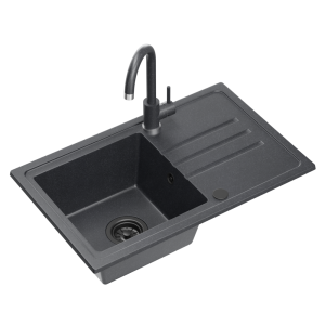 - Nowoczesny, czarny design – zlew kuchenny jednokomorowy, bateria, syfon i zaślepka w jednym, spójnym kolorze.
