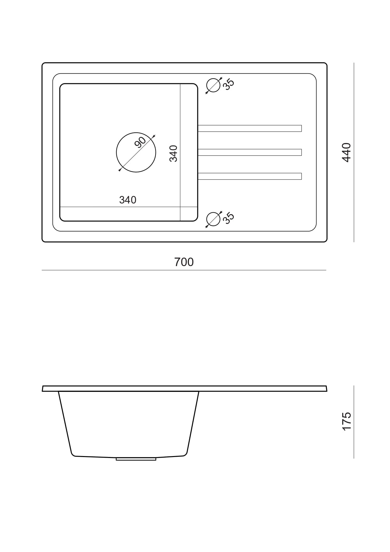 - Zlewozmywak granitowy 70 x 44 cm, jednokomorowy z ociekaczem,