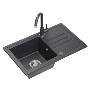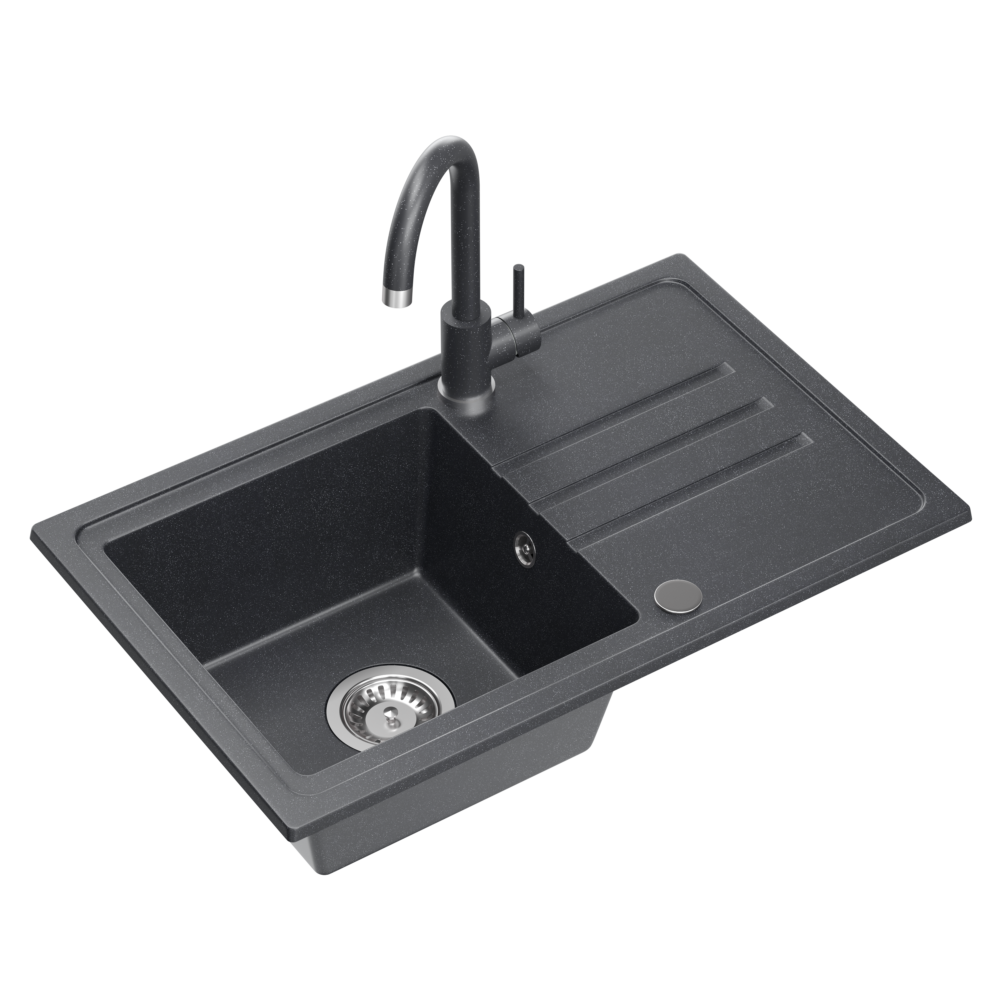 Zlewozmywak granitowy QUADRON BEN 111 70x44 CZARNY - Zlew kuchenny jednokomorowy z baterią KATE ze stałą wylewką kolor czarny + syfon + zaślepka