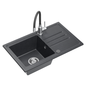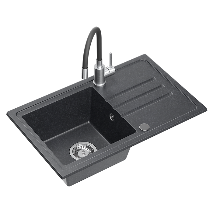 Zlewozmywak granitowy QUADRON BEN 111 70x44 CZARNY - Zlew kuchenny jednokomorowy z baterią MAGGIE z elastyczną wylewką + syfon + zaślepka