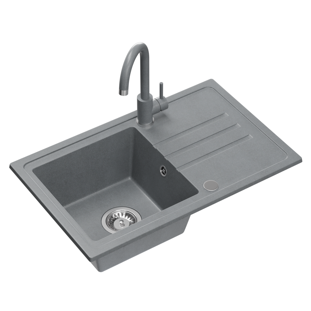 Zlewozmywak granitowy QUADRON BEN 111 70x44 SZARY - Zlew kuchenny jednokomorowy z baterią KATE ze stałą wylewką kolor szary + syfon + zaślepka