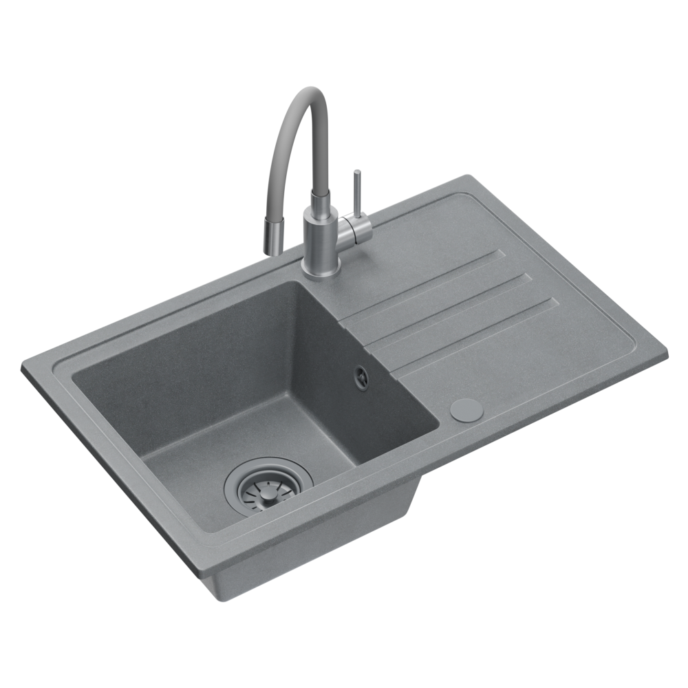 Zlewozmywak wykonano z wytrzymałego kompozytu na bazie cząsteczek granitu i wysokiej jakości spoiwa. Taki zlew granitowy szary jest odporny na zarysowania, uderzenia, wysoką temperaturę oraz codzienne zabrudzenia. Powierzchnia nie chłonie plam, nie odbarwia się i jest łatwa do utrzymania w czystości.
