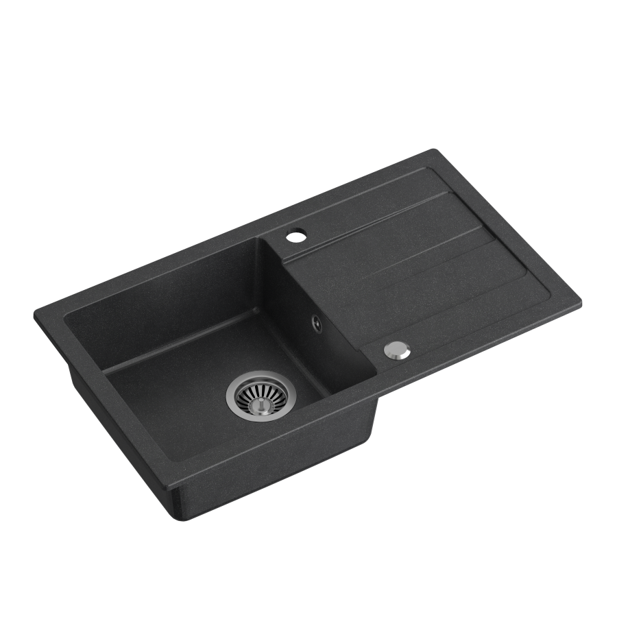 Jednokomorowy zlew granitowy 77x44 został zaprojektowany z myślą o wygodzie – głęboka komora ułatwia mycie większych naczyń, a zintegrowany ociekacz pomaga utrzymać porządek na blacie. Czarny kolor doskonale komponuje się zarówno z jasnymi, jak i ciemnymi frontami mebli.