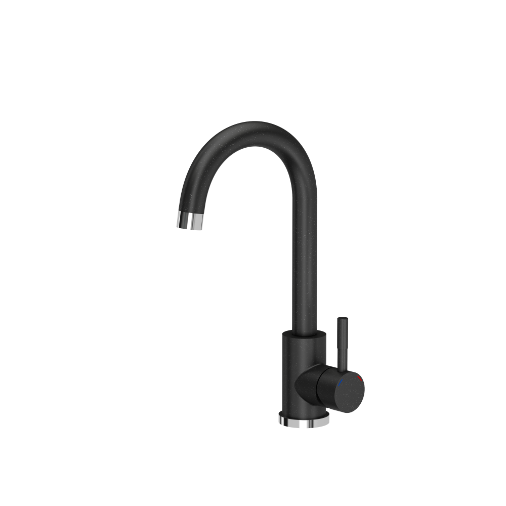 Zestaw uzupełnia bateria kuchenna KATE w kolorze czarnym, idealnie dopasowana stylistycznie do zlewozmywaka granitowego. Ceramiczna głowica zapewnia cichą, płynną pracę i wysoką trwałość, a wbudowany perlator napowietrza strumień wody, zmniejszając jej zużycie bez utraty komfortu mycia.
