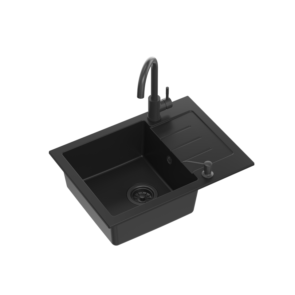 Johnny 116 Pure Carbon Limited Edition to kompletny, jednokomorowy zlewozmywak granitowy 60x44 cm z ociekaczem, baterią kuchenną, dozownikiem na płyn i funkcjonalną matą Qmata. Całość tworzy spójny, czarny zestaw, który łączy elegancki wygląd z wysoką trwałością i wygodą użytkowania w codziennej kuchni.