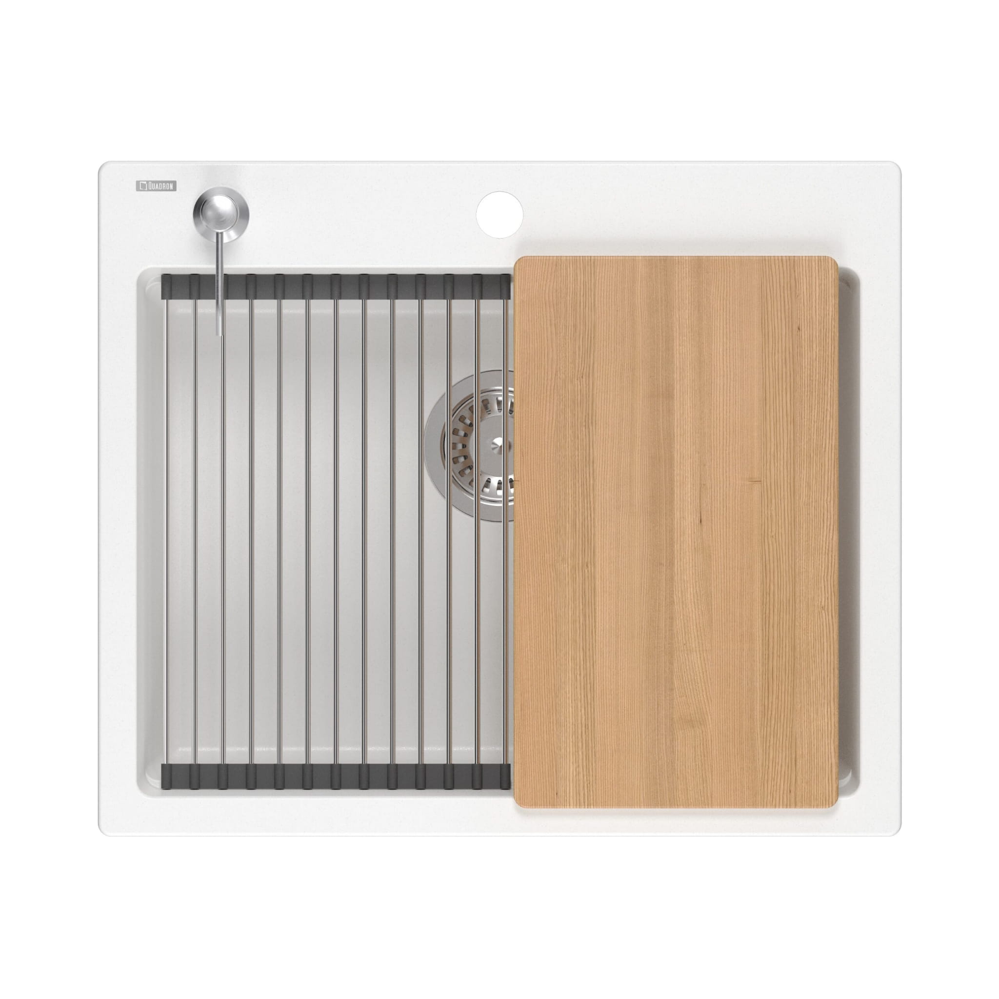 Wewnątrz komory zastosowano dodatkowy rant, na którym opiera się Qmata oraz stalowa wkładka ociekowa, a deska do krojenia stabilnie leży na wierzchu komory. Dzięki temu zlewozmywak zyskuje funkcję dodatniego blatu roboczego – możesz wygodnie kroić, płukać i suszyć produkty dokładnie nad komorą zlewu.