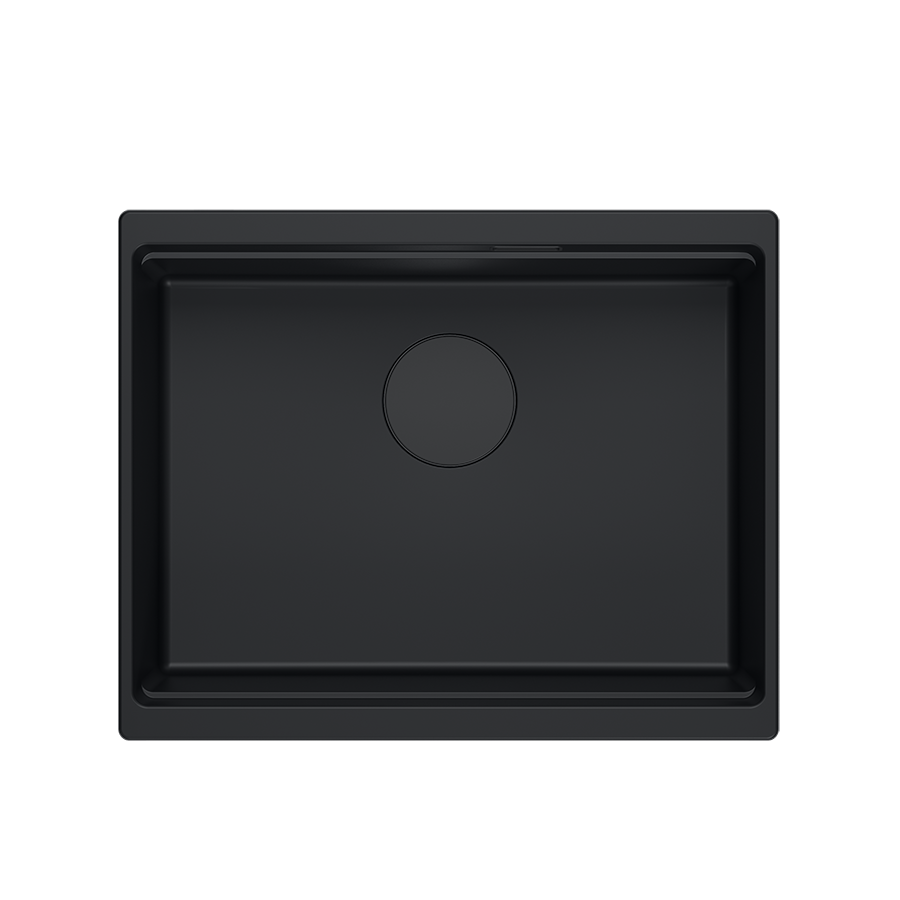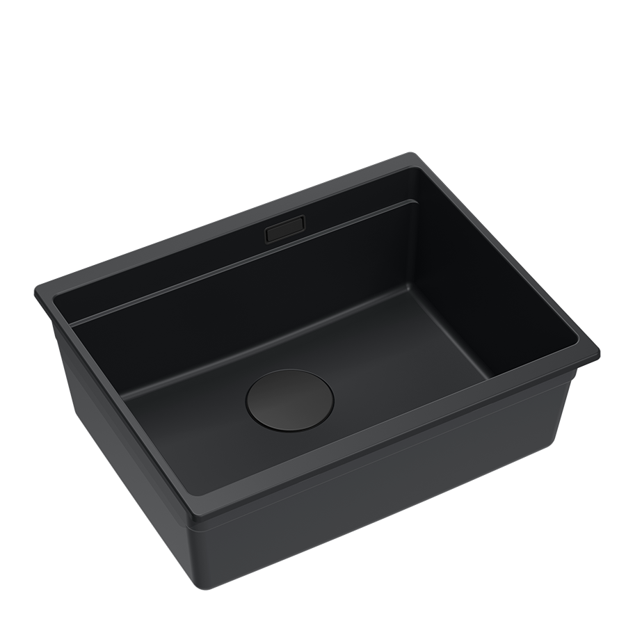 Monolityczna, gładka powierzchnia w kolorze PURE CARBON (czarny) nadaje aranżacji elegancki, ponadczasowy charakter i świetnie współgra zarówno z jasnymi, jak i ciemnymi blatami oraz armaturą złotą, stalową czy czarną.