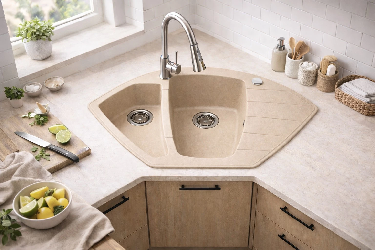 Zlewozmywak granitowy RUVETTI HORNET 90x53,8 cm beżowy - zlew narożny 1,5-komorowy