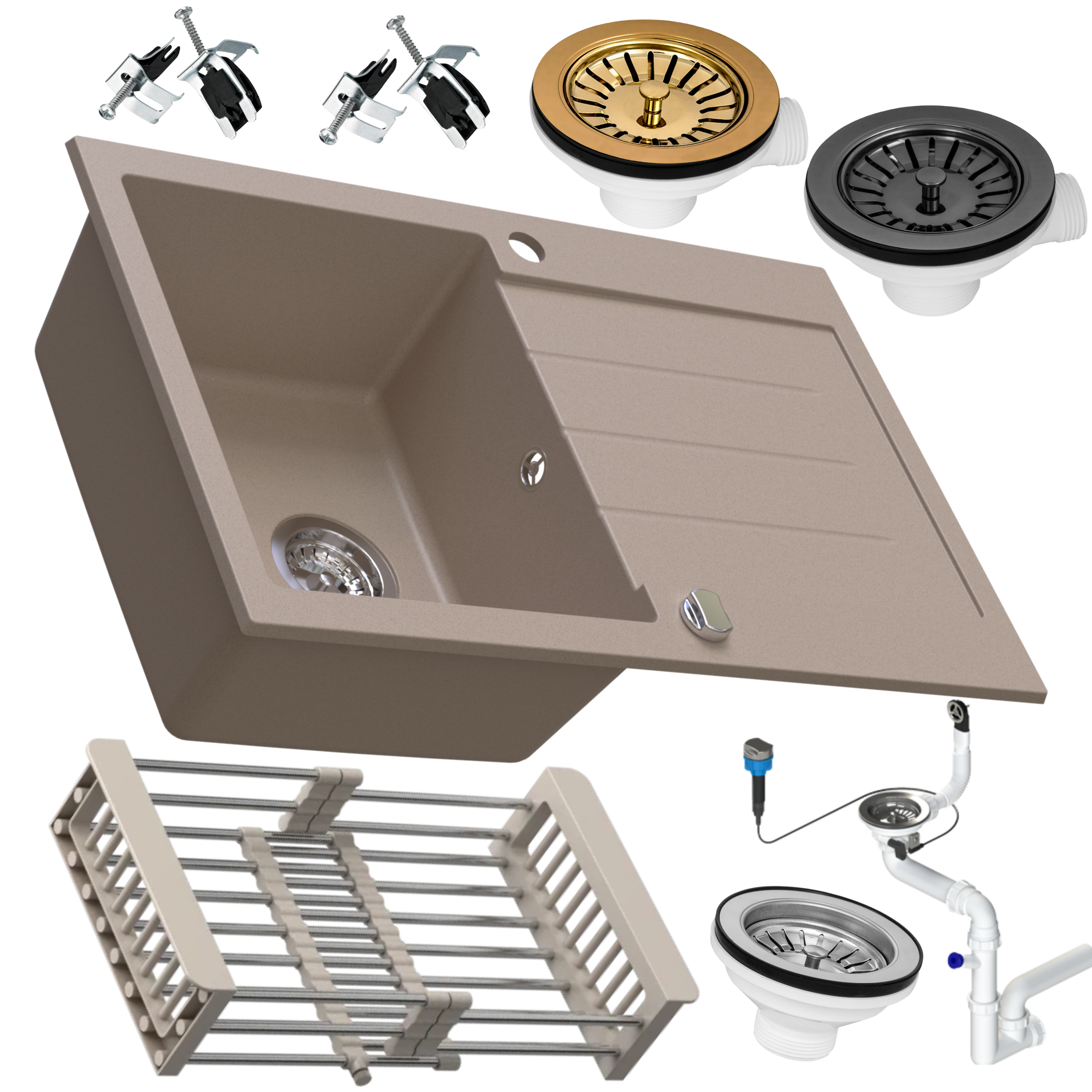 - Dodatkowo w zestawie: ociekarka teleskopowa, karta gwarancyjna, szablon wycięcia otworu pod montaż zlewozmywaka, syfon zlewozmywakowy z automatycznym sterowaniem korka.