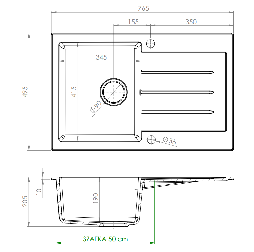 - Typ zlewu: 1-komorowy z ociekaczem
