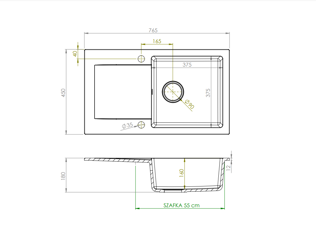 - Typ zlewu: 1-komorowy z ociekaczem