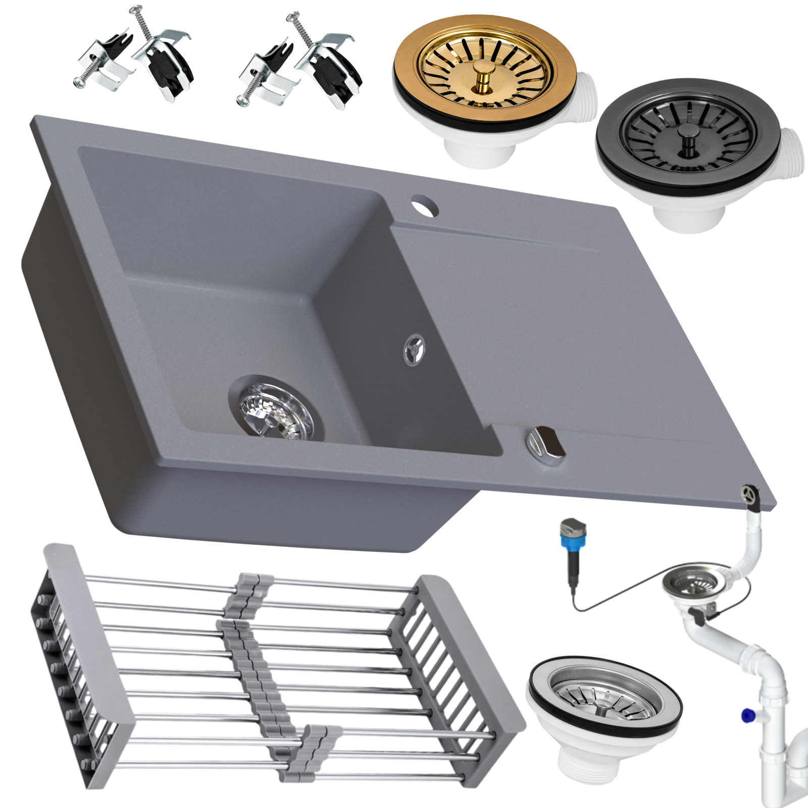 - Dodatkowo w zestawie: karta gwarancyjna, szablon wycięcia otworu pod montaż zlewozmywaka, syfon zlewozmywakowy z automatycznym sterowaniem korka.