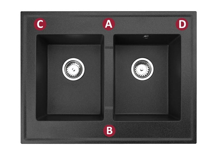 Standardowo zlewozmywaki posiadają dwa wykonane otwory oznaczone jako A i B. Istnieje jednak możliwość wyboru innej konfiguracji otworów zgodnie z oznaczeniami A-B-C-D, dzięki czemu można dopasować układ elementów do własnych potrzeb oraz układu instalacji w kuchni.